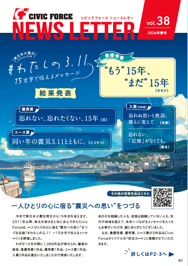 また、Civic ForceのNPOパートナー協働事業では、被災地の経験や教訓を他の地域や後世に伝え、次の災害に備える取り組みを応援しています。本号2〜3ページではさまざまな形で震災伝承を行う各団体の活動についてご紹介いたします。